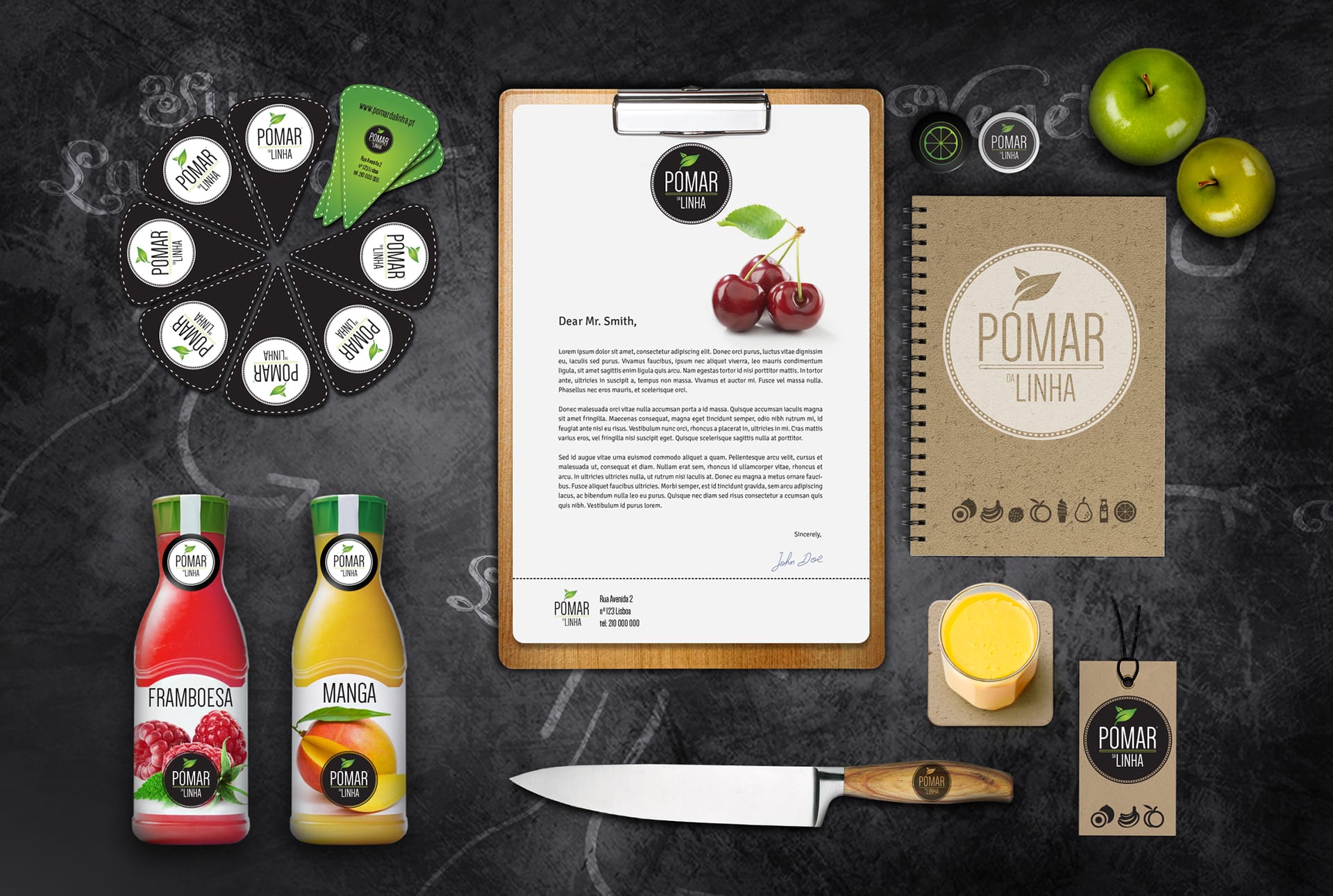 Pomar da Linha é um projecto criado para uma mercearia de produtos biológicos na linha de Cascais. Para este cliente apostámos numa imagem jovem, criando o logotipo, toda a imagem de rótulos e estacionário.